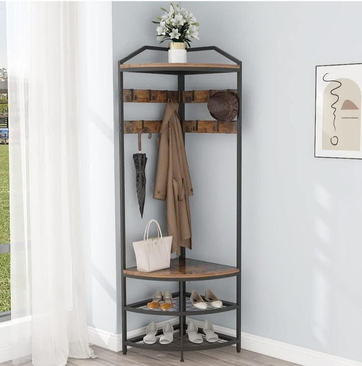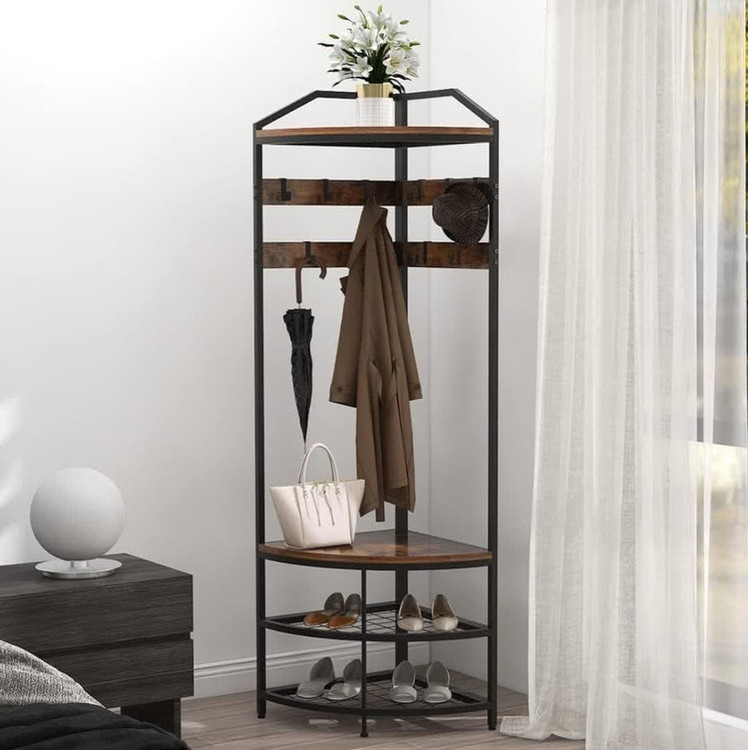 رگال لباس و جاکفشی گوشهای فلزیچوبی، مخصوص کسانی طراحی شده که میخواهند از هر سانتیمتر خانهشان به بهترین شکل استفاده کنند. این رگال با ساختار فلزی مستحکم و طبقات چوبی باکیفیت، امکان نگهداری انواع لباس، مانتو، کیف، کفش و اکسسوریها را فراهم میکند.
