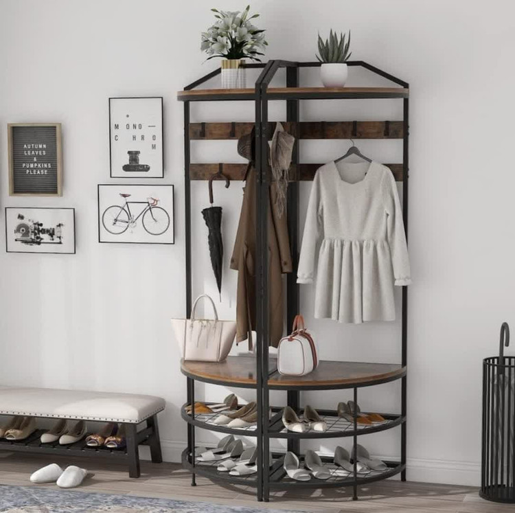 رگال لباس و جاکفشی گوشهای فلزیچوبی، مخصوص کسانی طراحی شده که میخواهند از هر سانتیمتر خانهشان به بهترین شکل استفاده کنند. این رگال با ساختار فلزی مستحکم و طبقات چوبی باکیفیت، امکان نگهداری انواع لباس، مانتو، کیف، کفش و اکسسوریها را فراهم میکند.