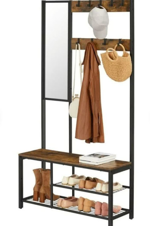 در بخش بالایی، چند قلاب محکم برای آویزان کردن کیف، کلاه، شال و لباس قرار دارد. آینهی قدی کنار رگال به شما کمک میکند قبل از خروج، ظاهر خود را چک کنید. در قسمت پایینی نیز دو طبقه جاکفشی فلزی مقاوم قرار گرفته که گنجایش چندین جفت کفش را دارد.
